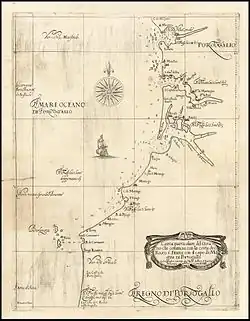 "Carta Quarta Generale di Europa", 1646 is one of the larger scale, generalised (Carta Generale) maps and shows the West coast of France, southward from La Rochelle, and the Northern coast of Spain. This is the least ornate of the styles adopted by Dudley with no adornment other than the cartouche and a compass rose and fairly plain calligraphy.
