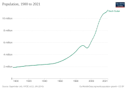 South Sudan is home to around 60 indigenous ethnic groups and 80 linguistic partitions among a 2021 population of around 11 million.[1][2] Historically, most ethnic groups were lacking in formal Western political institutions, with land held by the community and elders acting as problem solvers and adjudicators. Today, most ethnic groups still embrace a cattle culture in which livestock is the main measure of wealth and used for bride wealth.