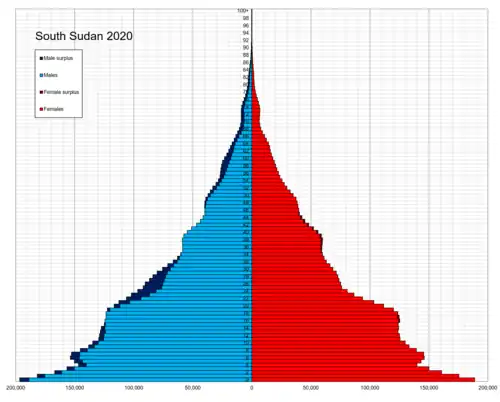 It was estimated that the 2021 population of South Sudan was 10,748,272[1][2] with the following age structure: