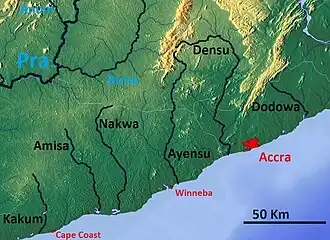 The Densu River is a 116 km long river in Ghana rising in the Atewa Range.[2] It flows through an economically important agricultural region, supplies half the drinking water to Ghana's capital city of Accra. The river ends in an ecologically significant wetland delta[3] on the coast of the Atlantic Ocean.[4] The Densuano[5] Dam and Weija Dam[6] are situated on the Densu River.