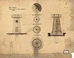 The tower was constructed in the unique Queensland method of constructing a timber frame and cladding it with non-structural iron plates or iron sheets.[2] The original apparatus comprised a fourth order lens with an oil wick burner[8] of 4,000 cd intensity.[2] Like other lighthouses at that time it used a clockwork mechanism with weights, which had to be wound periodically. Due to its short height, only 6 metres (20 ft) from the base to the lantern,[4] the mechanism had to be wound every 75 minutes.[9]