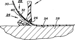 Side view of a drum dermatome blade (24) removing a slice of skin (38 and 40).