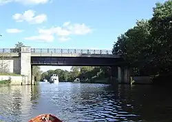 The 3⁄4–mile (1–km) Desborough Cut takes the Thames directly between the brief Weybridge bank to the upper (south) part of the Walton bank — creating Desborough Island between it and the river meanders which front much of Old Shepperton and Lower Halliford in Shepperton.[1] The meanders remain navigable. They are of similar width to the cut.[1] The cut alleviated flooding at Hamm Court and in Shepperton[2] and halves the distance of travel from its start to its finish.