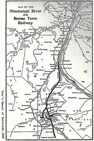 The main line and connections of the Mississippi River & Bonne Terre Railway, built to serve lead mines in southeastern Missouri