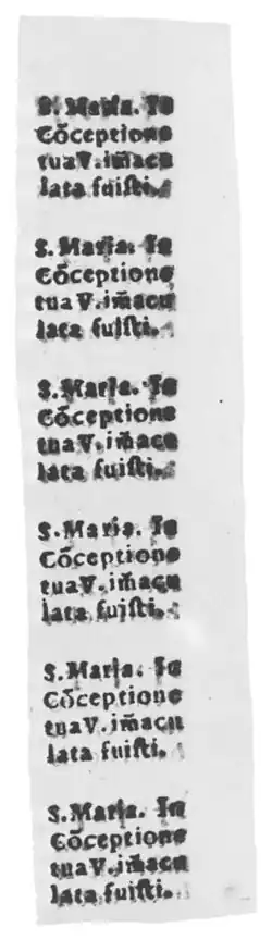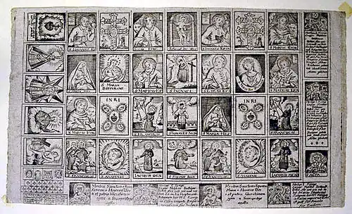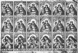 Schluckbildchen were used in either practices of organized religion and folk religion.[9] On August 3, 1903, the Roman Congregation for the Doctrine of the Faith announced that as long as there were no superstitious practices involved, the use of Esszettel was officially granted.[10] According to Eduard Stemplinger on the other hand, on July 29 the same congregation had already decided that swallowing water-soaked paper notes with Madonna images printed on them in order to heal illnesses certainly did not count as superstition.[11]