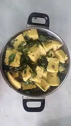 Dhokla is a savoury sponge dish that is native to the Indian state of Gujarat and parts of adjacent states,[1] and is popular throughout the country. It is made with a fermented batter that is steamed to a cake-like consistency. The batter consists of a mixture of rice with the pulse Bengal gram,[2] but has several variants with the gram replaced by chickpeas, pigeon peas, or urad beans.[3][4]