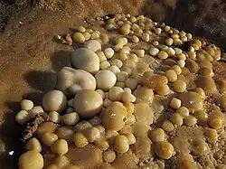 The cave is mostly limestone, which was laid in the late Mississippian Period when most of Kentucky was under a shallow warm sea.[2] There are also large deposits of calcite. Fresh water dissolves the limestone, and then deposits the mineral as the water itself loses its acidic nature.[3] Other speleothems (formations) which can be viewed at Diamond Caverns include: Soda Straws, Stalactite, Columns, Flowstone, Drapery/Bacon Strip, and Cave Pearl.[4]