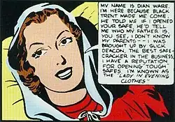 In Dian Belmont's first adventure she was originally a thief named the Woman in Evening Clothes whom Sandman foiled a robbery by.[2] After a few more stories, her past as a gentlewoman thief was entirely forgotten; she became the rich socialite girlfriend of Wesley Dodds and a fellow detective in his guise as Sandman, with her father being district attorney Lawrence Belmont. A distinction between Dian and most other superhero girlfriends was that Dian was fully aware of Wesley's Sandman identity and was a constant aid in his war on crime and less a damsel in distress. In Adventure Comics #69 (December 1941), Sandman was given a new look and sidekick in Sandy the Golden Boy. Dian disappeared from the strip and did not reappear for several decades, until it was explained that Sandy was her nephew and that she had died sometime before the Second World War.[3][4]