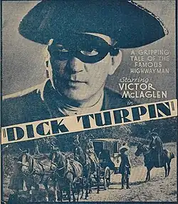 Dick Turpin is a 1933 British historical drama film directed by Victor Hanbury and John Stafford. It starred Victor McLaglen, Jane Carr, Frank Vosper, James Finlayson and Cecil Humphreys. The film depicts the adventures of the eighteenth century highwayman Dick Turpin and his legendary ride to York.[2] It was based on a historical novel by Harrison Ainsworth.
