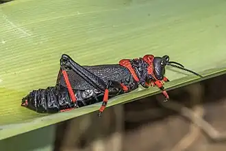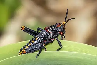 Adult males are typically 4.5–5 cm (1.8–2.0 in) long and females typically 5–7 cm (2.0–2.8 in),[4] but can grow up to a length of 8 cm (3.1 in).[5] The neck shield has a warty surface, and the grasshopper's colors are highly variable but usually with at least parts that are contrasting and bright. It is toxic due to the poisons that it sequesters from its diet, which includes a large number of toxic and distasteful plants such as milkweed.[5]