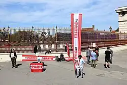 Its campaign slogan was "For Europe, Against Europe", which Sonneborn explained that the PARTEI was inclusive—it welcomed the 70% of Germans opinion polls said were not interested in Europe, "But we also say yes to Europe so everybody opposed to or in favour of Europe can vote for us".[22] Specific campaign pledges included promising to "build a wall around Switzerland, put Chancellor Angela Merkel on a show trial in the Berlin Olympic stadium and to frack the rotund politicians Sigmar Gabriel and Peter Altmaier for cheap gas".[22]