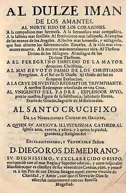 18. ^ "Aclamacion posthuma. Immortal fama. Panegyrico clarin de virtudes… Con que el Illustrisimo Cabildo de la Santa Iglesia Cathedral de la ciudad de Orense publicó… à las Letras su Descanso, el Illmo… Diego Ros de Medrano… – Orbis Imagines". orbisimagines.iarthislab.eu. Retrieved 2024-03-29.