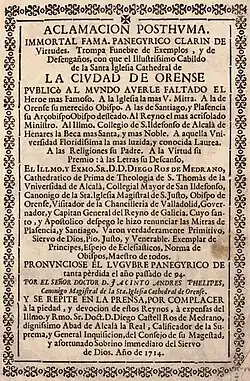 "Posthumous Acclamation. Immortal fame. Panegyric trumpet of virtues. Funereal trumpet of examples, and of disillusionments, with which the Most Illustrious Chapter of the Holy Cathedral Church of the city of Orense publicly announced to the world the loss of the most famous hero ... D.D. Diego Ros de Medrano ... The mournful panegyric of such loss was pronounced last year of 94." - by Dr. Jacinto Andres Phelipes (Granada, 1714)[18][19]
