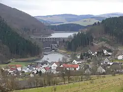 The Diemel Dam: dam and reservoir, compensating basin (Ausgleichsweiher) and power station. Foreground: the village of Helminghausen. Left: the Eisenberg
