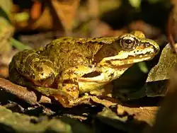 Little evidence has been found of tawny owl predation on reptiles. Despite their scarcity about a dozen species are known to be hunted by this predator, including a couple species of snake and several lizard species.[1][34][127][88][128] They are more or less taken incidentally, constituting always less than 2% of the foods in known European studies.[34][129][130] An exceptional case was in Sahel, Algeria, where the Moorish gecko (Tarentola mauritanica) was the leading prey species at 16.75% of 2472 prey items.[75] Amphibians are generally much more prominent in the tawny owl's diet, almost exclusively frogs.[1] Nearly 20 species of amphibian are known to be taken, which includes two species of newt outside of the more typical frogs and toads.[1][34][75][131][132] Key to predation on frogs is the composition of the habitat, with frogs and toads being apparently much more accessible in remote and conserved areas rather than developed lands.[1] In different areas of Poland, the Rana genus of frogs led the prey composition such as in Białowieża Forest, where they made up 21.1% of the foods, in Wigry National Park where they constituted 17.4% of the diet and in the northeasterly section of the country where they made up 23.4% of 2046 vertebrate prey items.[123][133][134] Elsewhere frogs and amphibians are regular but secondary foods. Of 3194 prey items in Finland, amphibians (probably all frogs) were secondary to rodents, and could account for from 16.6% in good vole years to 19.5%, the leading prey type by number, in bad vole years, with an average 17.5%. from all years.[135] In Lithuania, frogs constituted 14.5% of 1125 prey items, with the common frog (Rana temporaria) in particular accounting for 11.2%.[136] In Sahel, Algeria, the Mediterranean painted frog (Discoglossus pictus) was a fairly important prey resource, at 9.22% by number and 10.5% by biomass.[75] The average size of frogs taken can be fairly variable, from an estimated 7 to 39.8 g (0.25 to 1.40 oz), as claimed for central Italy and England, respectively.[35][53] There are now several instances known of tawny owls preying on fish, though they are not known to be a significant food source anywhere in the distribution.[1][34] About eight species of wild fish are known to have been captured, including probably young or infirm specimens of large fish such as northern pike (Esox lucius) and brown trout (Salmo trutta), with at least some instances of tawny owls also catching ornamental goldfish (Carassius auratus) as well.[1][34][91][137]