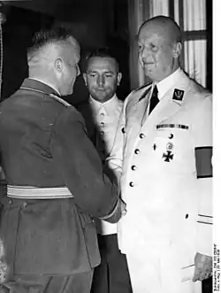 The role of the SA ambassadors was that of "quasi-Reich governors" as they aggressively supervised the internal affairs of the nations they were stationed in, making them very much unlike traditional ambassadors.[29] The aristocratic professional diplomats who dominated the Auswärtiges Amt saw the SA ambassadors as "outsiders", the disparaging term used by the professional diplomats to describe anyone who was not part of their clique.[29] The German historian Daniel Siemans wrote that it was significant that four of the five SA ambassadors had served as policemen in their careers, suggesting it was their ability to impose their will on others as police chiefs that led them for them being appointed as ambassadors.[30] From the viewpoint of Berlin, southeast Europe was viewed as the ergänzungsraum ("complementary space") to the lebensraum ("living space") in Eastern Europe.[31] Unlike the lebensraum, which was to be colonised with millions of German settlers while the indigenous peoples living there would be exterminated, expelled or enslaved, the ergänzungsraum were seen as a source of food, raw materials and manpower that would assist the Reich in its quest for "world power status".[31] Because the states in the ergänzungsraum were not to be colonised, the role of these states were seen as essentially protectorates of Germany that would be allowed a nominal independence as long as they played their role in the "New Order in Europe".[31] Those who knew him reported that Jagow was "deeply unhappy" about serving as a diplomat as he much preferred to be fighting in the war.[32] Hungary was a society dominated by the Magyar nobility who owned most of the land and generally held almost all of the high offices of the Hungarian state. It was felt that Jagow as a nobleman was the best man to talk to the Magyar aristocracy, who would have resented it if the German minister was a commoner.