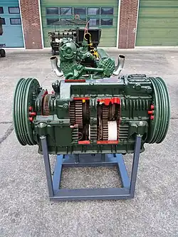 In the Maybach double-differential, power is transmitted through a single main transmission and then through an epicycle gear final drive on each side. A different drive speed is caused by feeding torque, from a separate "steering" transmission, into one final drive or the other using a pair of clutches. Usually the steering input turns at a fixed ratio relative to the engine, which results in a different turn radius for each main transmission ratio. This system was implemented on German Panther tanks during World War II.[1] The drawback of this design compared to other multiple-differential designs is that applying the steering input to one track also increases the average speed of the two tracks, so the vehicle's speed is not constant.