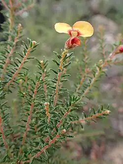 Dillwynia phylicoides, commonly known as small-leaf parrot-pea,[2] is a species of flowering plant in the family Fabaceae and is endemic to eastern Australia. It is an erect to open shrub with twisted, linear to narrow oblong leaves, and yellow and red flowers.