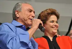 Dilma Rousseff 2010 presidential campaign was supported by the center-left electoral coalition Para o Brasil Seguir Mudando (English: For Brazil to Keep on Changing), created by the Workers' Party (PT) to run in Brazil's 2010 general election. It included ten parties: PT, PMDB, PCdoB, PDT, PRB, PR, PSB, PSC, PTC and PTN. On 14 October, the PP unofficially joined the coalition. Dilma Rousseff had Michel Temer, from the PMDB, as her vice-president. They were elected on 31 October, and took office on 1 January 2011.[1][2][3]