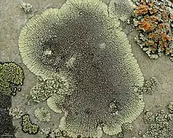 Dimelaena is a genus of lichenized fungi in the family Caliciaceae.[1]: 260 Members of the genus are commonly called mountain lichens,[2] or moonglow lichens.[1]: 260 They are placodioid crustose lichens, ranging in form from rimose to areolate.[1] The genus has a widespread distribution and contains eight species.[3]