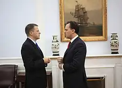 In 1999, Droutsas went back to Greece to serve as the Special Advisor to Minister of Foreign Affairs of Greece, George Papandreou. Among the important issues, he advised on were political rapprochement with Turkey, Cyprus’s accession to the EU and the Cyprus problem. In March 2004, he was appointed the Director of the Diplomatic Cabinet of the President of Panhellenic Socialist Movement (Pasok) George A. Papandreou. From March 2008, he served as the spokesperson of Pasok and in May 2008, he was appointed its Secretary for Foreign Policy and International Relations. On 7 September 2010 Droutsas was appointed the Minister of Foreign Affairs of Greece in a cabinet reshuffle.[2] His first tour as a foreign minister was to the Middle East from October 17 to October 20 with stops in Jordan, Israel and Palestinian territories, Egypt and Lebanon.[3][4]