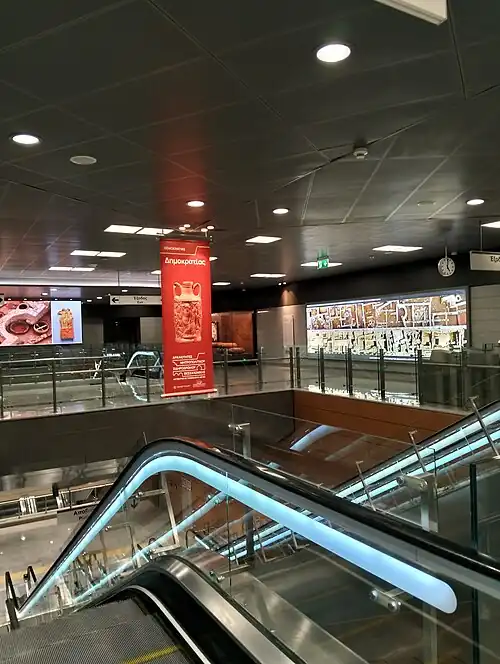 Dimokratias (Greek: Δημοκρατίας, ⓘ, lit. 'Democracy [Square]')[3] is a metro station serving Thessaloniki Metro's Line 1 and Line 2. It entered service in 2024.[4] Construction of this station has been held back by major archaeological finds, and it is designated as a high-importance archaeological site by Attiko Metro, the company overseeing its construction.[5] At this station, an ancient and early Christian cemetery & church were found, as well as Ottoman inns and warehouses.[5] The station was initially located further west, but was moved eastward so that it falls outside of the medieval Walls of Thessaloniki, thus reducing the chance of major archaeological works.[6]