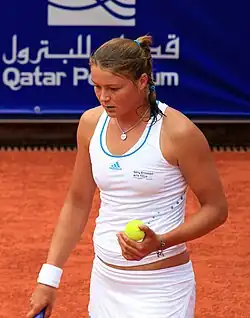At the French Open, Safina made the quarterfinals at a Grand Slam for the first time in her career. In the fourth round, she defeated fourth-seeded Maria Sharapova.[30] In the third set, she trailed 1–5 and was down a match point but won after almost 2½ hours of play. She went on to lose to Kuznetsova in the next round.[31] To kick off the grass court season, she reached her first grass court final at 's-Hertogenbosch, losing to Michaëlla Krajicek.[32] She then lost in the third round of Wimbledon, losing to Ana Ivanovic.