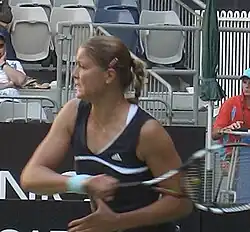 Safina won her second title over Katarina Srebotnik at Palermo in July 2003.[17] She lost in the first round in her debuts at the Australian Open, French Open and Wimbledon, although she reached the fourth round at the US Open before losing to second seed and eventual champion Justine Henin.[18] She also made the quarterfinals in Doha,[19] Sopot[20] and Shanghai.[21] She beat world No. 11 Magdalena Maleeva in Moscow, her best win at that point.[22] She finished the season as world No. 54.[16][23]