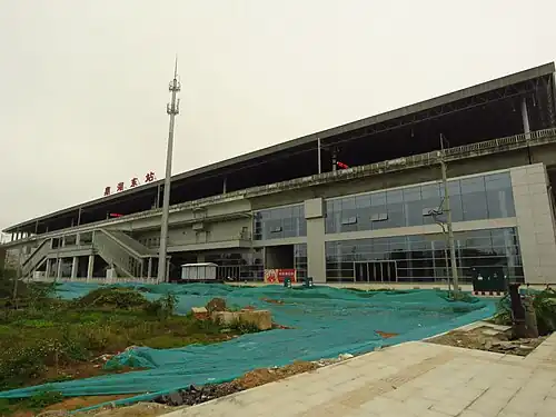 Dinghu East railway station (Chinese: 鼎湖东站) is a railway station in Yong'an, Dinghu District, Zhaoqing, Guangdong, China. It is an intermediate station on the Guangzhou–Zhaoqing intercity railway. It opened with the line on 30 March 2016.[1][2] The station has two island platforms. It is situated adjacent and perpendicular to Zhaoqing East railway station and a walkway is provided for transfer between the two stations.