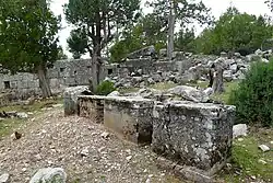 Diogenes constructed a rectangular piazza surrounded by a portico, and furnished with statues.[3] On one of the smaller sides he placed a portal, with perhaps his mausoleum on the opposite side. On the two larger sides he inscribed a lengthy account of Epicurean doctrines.[3] The inscription was 2.37 meters high,[4] and extended about 80 meters. It was originally about 25 000 words long and filled about 260 square metres of wall space.[5] It was discovered in 1884, and the first 64 fragments were published in 1892. Since then, more fragments have been discovered, notably in a series of excavations led by Martin Ferguson Smith.[4] Perhaps a quarter of the inscription has been recovered.[4] New parts are being discovered in the excavations of the Deutsches Archäologisches Institut;[6] among the parts discovered in 2008 was a statement on Plato's theory of cosmogony.[7]