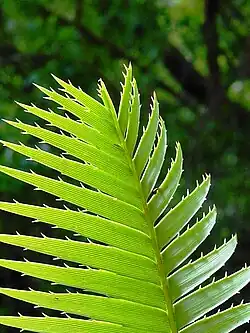 The leaflets are simple, often with a prickly edge. The primary nerve consists of many forked dividing nerves, without a recognizable midrib. The nerves spring directly from the edge of the leaf rhachis and then run towards the plumage axis. The spars are hairy at least on young leaves. The hairs (trichomes) are colorless, branched or simple.