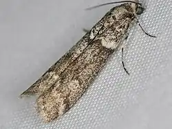 The wingspan is 21โ€“27 mm. The forewings are dark gray with a fine, sparse, white dusting, making the general color a dark ash gray. The hindwings are white, but smoky at the apex and somewhat along the termen.[2]