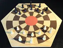 Diplomat chess is a chess variant invented by Carlos Martín-Fuertes in 2003 as a contribution to a contest to design a chess variant on 43 squares, organised by The Chess Variant Pages.[1] It is played on a circular board with 43 cells, including the center circle which is considered orthogonal and diagonal to every adjacent cell. The game includes a fairy piece called the 'diplomat' which instead of capturing can suborn enemy pieces.[2]