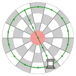 The rook, bishop, horse (knight) and king move as in orthodox chess. The movement through the center is illustrated by the figure. From the center, a rook and a bishop can reach any square on the board. A horse in the center can reach any square in the two inner rows (2 and 3). The rook is not allowed to do a "null move", i.e. to move 360° around the board back to the same square in one move.