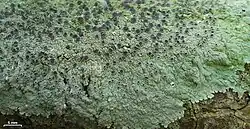 Apothecia are often present, found laminal on the thallus, with diameters ranging from 0.5 to 1.5 mm. The disc is black, slightly grayish pruinose, sometimes lacking a pruina. Ascospores are brown, 1-septate, narrowly ellipsoid, with dimensions of 12-19 x 5-7 μm. Pycnidia are immersed in warts, containing bacilliform conidia measuring 3-4 x 1 μm.[3]