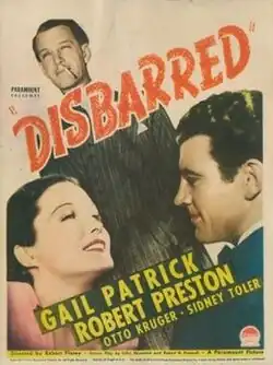 Disbarred is a 1939 American crime film about a crooked lawyer starring Gail Patrick and Robert Preston.[1] The supporting cast includes Otto Kruger, Virginia Vale and Sidney Toler. The movie was directed by film noir specialist Robert Florey.[1]