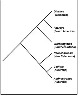 A simplified phylogeny derived from molecular analysis[10] showing the phylogenetic relationship of Diselma to closely related genera in the Cupressaceae. Diselma's closest relative appears to be the South American genus Fitzroya.