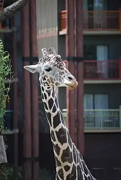Around the lodge, there are three total 11-acre savannas (Sunset Savanna, Arusha Savanna, Uzima Savanna) housing a variety of African mammals and birds including addax,[17] Ankole cattle, bongo, bontebok, eland, gemsbok, Grant's zebra, greater kudu, impala, okapi,[18] red river hog,[19] reticulated giraffe, Thomson's gazelle, waterbuck, white-bearded wildebeest, Abyssinian ground hornbill, blue crane, East African crowned crane, greater flamingo, Marabou stork, ostrich, pink-backed pelican, and Rüppell's griffon vulture.[20]