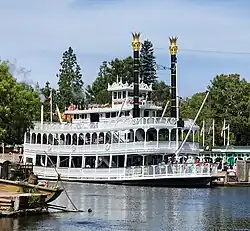 The first was the Mark Twain Riverboat, located at the Disneyland theme park in Anaheim, California, on which passengers embark on a scenic, 12-minute journey around the Rivers of America. Originally named Mark Twain Steamboat when the park opened in 1955, the 5/8-scale stern-wheeler was the first functional steamboat to be built in the United States for 50 years.[1] Other Disney riverboat attractions also appear at Tokyo Disneyland and Disneyland Park Paris.