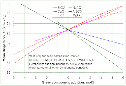 Influences of selected glass component additions on the mean dispersion of a specific base glass (nF valid for λ = 486 nm (blue), nC valid for λ = 656 nm (red))[3]