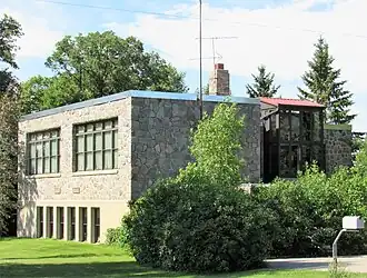 District No. 182 School, also known as the Barnhard School, is a historic building located north of Underwood, in rural Otter Tail County, Minnesota, United States. The building was listed on the National Register of Historic Places in 1991.[1] The school district was established in Sverdrup Township on January 3, 1884, and its first building was a log house constructed by John Randall. It was named for William Barnhard, one of the founders of the district.[2] The log building was replaced the following year by a single-story frame structure, and it was replaced by a two-story frame structure in 1905. By the 1930s this building had become dilapidated and it was considered a fire trap. In July 1938 local voters passed a bond issue and the Works Progress Administration approved the application to construct a new school building. Fergus Falls architect E.O. Broaten designed the building in the Moderne style. The T-shaped structure features a raised basement of exposed reinforced concrete and split-stone walls on the main level. The main level contained two classrooms, a library, and an office, while the basement housed a community room with a stage, a kitchen, fuel room, boiler room, and storage room. The building served as a school until 1982. Five years later a non-profit arts group reopened it as an art center, but foundered after encountering financial difficulties. The former school stood vacant for years and was put up for sale in 2000. Sandra Barhouse, an art professor from St. Cloud State University, purchased the building and undertook an extensive renovation into a private residence and art gallery.[3]