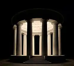 Designed by Washington architect Frederick H. Brooke, with Horace Peaslee and Nathan C. Wyeth as associate architects, the District of Columbia War Memorial is in the form of a 47-foot (14 m) tall circular, domed, peristyle Doric temple. Resting on concrete foundations, the 4-foot (1.2 m) high marble base defines a platform, 43 feet 5 inches (13.23 m) in diameter, intended for use as a bandstand. Twelve 22-foot (6.7 m) tall fluted Doric marble columns support the entablature and dome. Preserved in the cornerstone is a list of 26,000 Washingtonians who served in the Great War. Inscribed on the base are the names of the 499 District of Columbia "residents and citizens" who died in service, listed in alphabetical order without regard to rank, race, gender, or national origin,[2] together with medallions representing the branches of the armed forces. The dome inscription reads, "A Memorial to the Armed Forces from the District of Columbia Who Served Their Country in the World War," and the base inscription reads, in part, "The names of the men and women from the District of Columbia who gave their lives in the World War are here inscribed as a perpetual record of their patriotic service to the country. Those who fell and those who survived have given to this and to future generations an example of high idealism, courageous sacrifice and gallant achievement."[3]