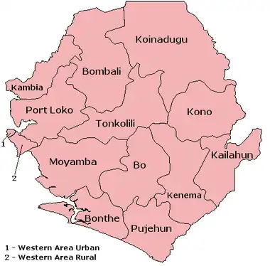 The provinces of Sierra Leone are divided into 16 districts, as of July 2017.[1][2] Previously, the country was divided into 14 districts. The Western Area is divided into two districts. Sierra Leone's capital Freetown is located in the Western Area of the country and its makes up the Western Area Urban District.