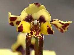 Diuris pardina, commonly known as the leopard orchid or leopard doubletail[2] is a species of orchid which is endemic to south-eastern Australia. It has two or three grass-like leaves and up to ten yellow flowers with reddish-brown marks and blotches.