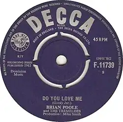"Do You Love Me" was released as a single in late August 1963, with the B-side, "Why Can't You Love Me", written by Tremeloes guitarist Alan Blakley. The single had been intended for release in late September, but was rush-released on 31 August to capitalise on the success of "Twist and Shout" and to combat a version by fellow beat group the Dave Clark Five which was set for release on 6 September.[31] "Do You Love Me" topped the four main music paper charts in the UK and became the group's only number one before the departure of Brian Poole in 1966, after which they achieved a further number one with "Silence Is Golden" in 1967.[35] "Do You Love Me" sold over 250,000 copies and was awarded a silver disc by Disc.[36]