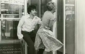The call between Pacino and Sarandon was improvised.[44] Lumet felt that Sarandon "had great taste", and that the actor would not resort to "homosexual clichés".[46] He deemed the humor of his improvisation as "genuinely funny", and that it was not "laughing at a gay character".[46] Sarandon felt that the conversation was welcomed by the audiences because it "wasn't about a drag queen and his boyfriend", and that it reflected two people that were "trying to come to grips with what is wrong in their relationship."[46] The film was characterized by its "light comic touch",[56] and according to critic David Thomson, for its "ear and instinct for comedy".[57] In Pierson's script, Wortzik's question regarding which country Sal wanted to escape to did not have a scripted response, but Cazale improvised by answering "Wyoming".[35] Lumet had to cover his mouth, as he nearly interrupted the scene by laughing.[34]