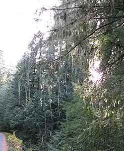 The species grows within the canopies of coniferous trees, primarily those found in old growth Douglas fir forests and near bodies of water. Air pollution heavily affects the metabolic functions of the species, and as a result, populations have declined.[7] Industrial logging has also had detrimental impacts on population numbers.[8]