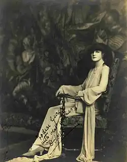 During the First World War, Duff-Gordon's focus shifted to her New York office which she had opened in 1910.[12] For her New York fashion shows she imported her own models from England, although Dolores was not among the first she brought over. The shows became so popular that she had to start holding them in a theatre.[11] It was probably at one such event around 1916 that Florenz Ziegfeld and his wife Billie Burke discovered Duff-Gordon's designs and her model Dolores.[11] Ziegfeld was enraptured by Dolores and the luxurious spectacle of the show and Burke ordered two of Duff-Gordon's creations.[12] Soon, Duff-Gordon was making costumes for Ziegfeld's theatrical productions, the Ziegfeld Follies.[13]