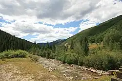 The Dolores River rises in a meadow called Tin Can Basin, near 12,520-foot (3,820 m) Hermosa Peak[5] in the San Miguel Mountains, in Dolores County, Colorado. The headwaters are located about 5 miles (8.0 km) south of Lizard Head Pass in the San Juan National Forest. The river flows southwest in a canyon past Rico, receiving the West Dolores River, then flows into McPhee Reservoir near Dolores in Montezuma County.[6] Formed by McPhee Dam, the reservoir is about 10 miles (16 km) long and diverts flows of the upper Dolores River for irrigation.