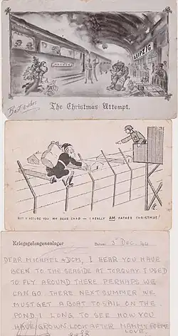 Bruce, like a lot of his comrades, participated in goon baiting.[26] Reinhold Eggers was the Colditz Castle's security officer succeeding Priem, and like Priem, was a schoolmaster by profession.[27] In his book 'Colditz: the German Story' (1961, translation by Howard Gee), Eggers describes how Bruce was fond of sowing confusion amongst the German guards during Appel, or roll call, using the 'rabbit run' prank. Bruce would stand in the ranks, wait until he had been counted, then duck quickly along the line, only to be counted again at the other end. This trick was also used for more serious purposes, to cover up for a missing escapee.[28]